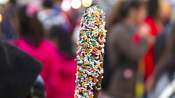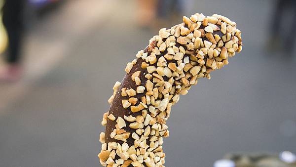 等到香蕉裹滿了巧克力,老闆就會請你選要沾花生粒還是巧克力米!